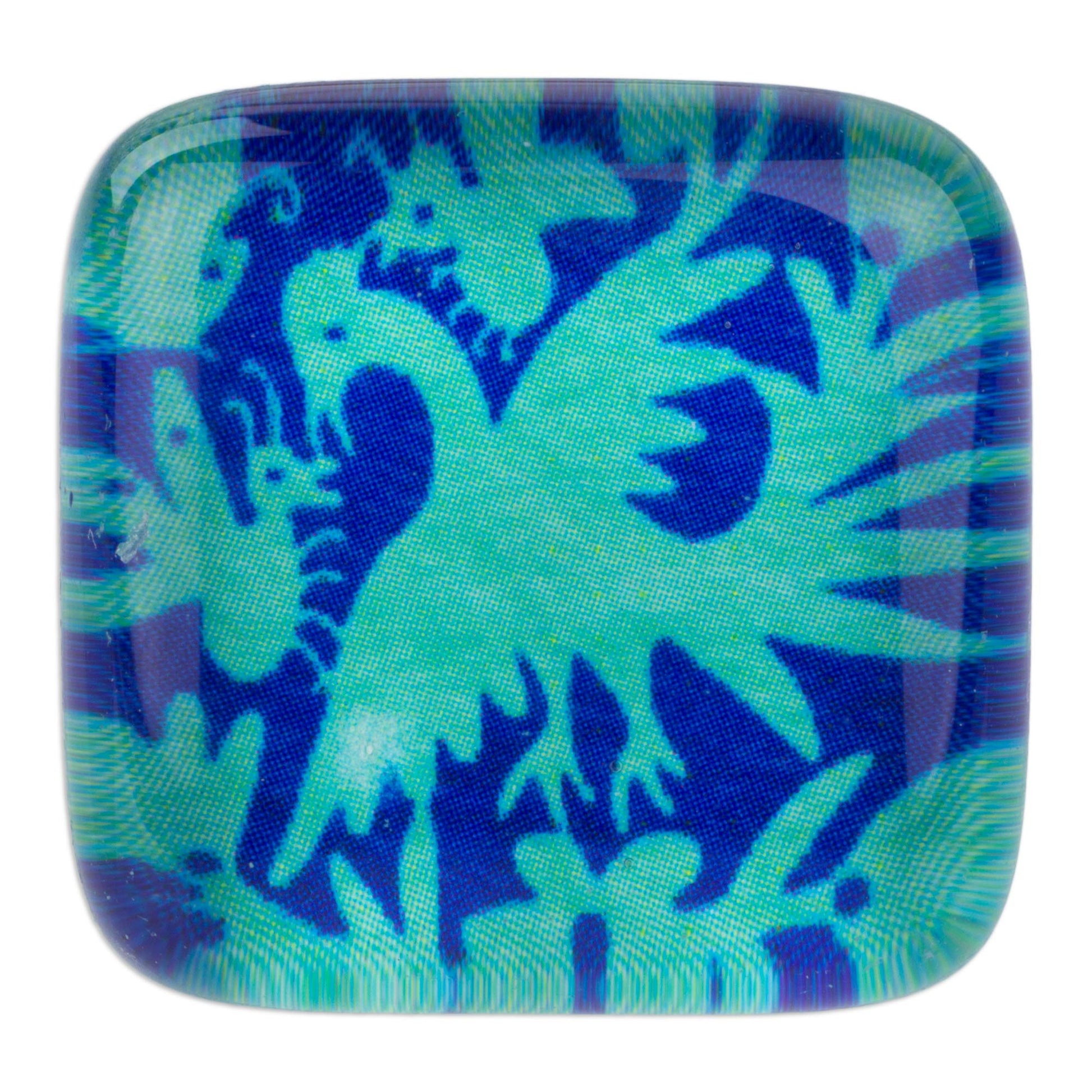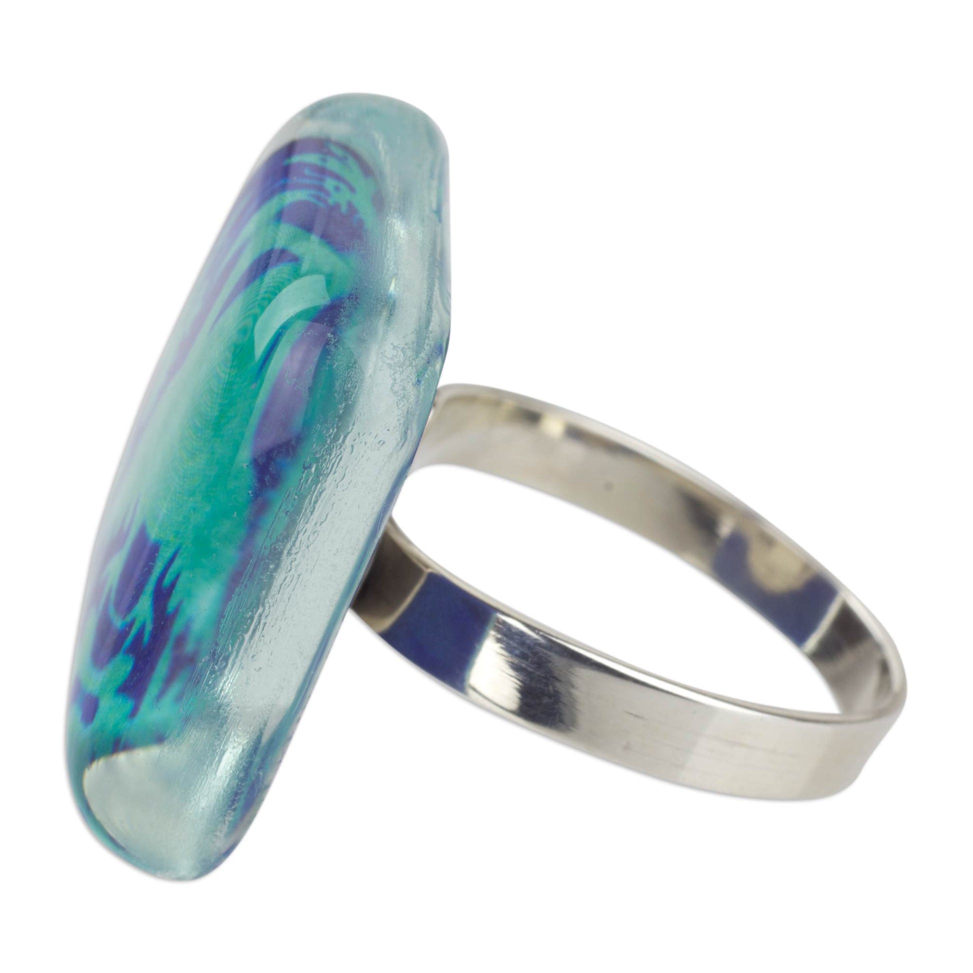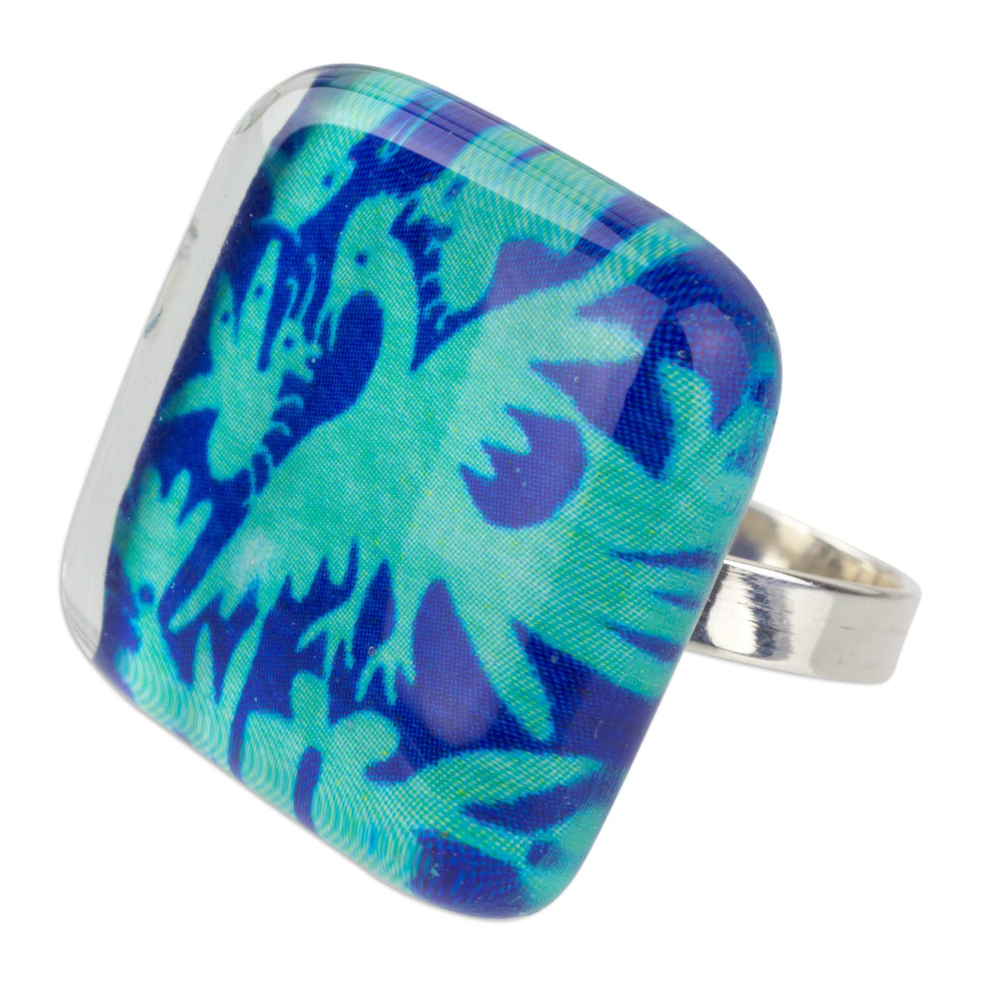 The legendary embroideries of Tenango inspire Gretel and Daniel in the design of this original cocktail ring. Stylized birds and butterlfies play among the flowers in a blue and turquoise fantasy. The Mexican artisans master fused glass techniques and incorporate printed couché paper to craft the sterling silver ring.