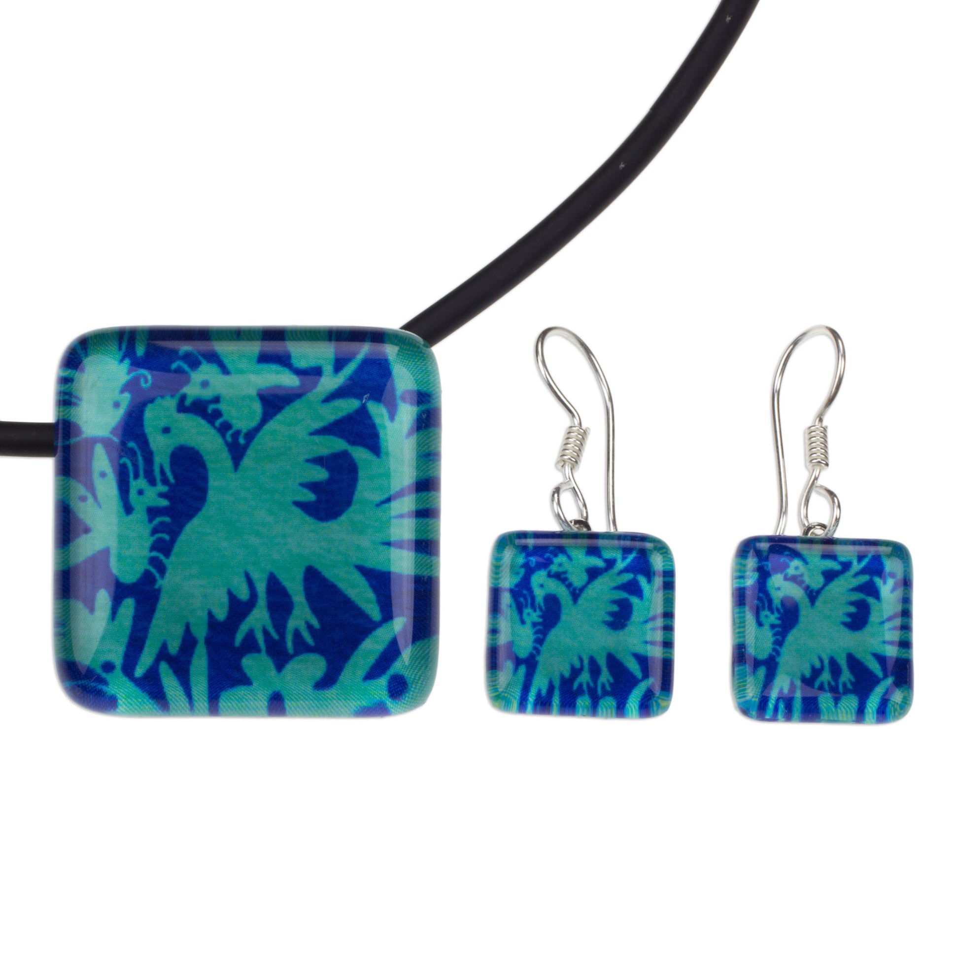 The legendary embroideries of Tenango inspire Gretel and Daniel in the design of this original jewelry set. Stylized birds and butterlfies play among the flowers in a blue and turquoise fantasy. The Mexican artisans master fused glass techniques and incorporate printed couché paper to craft the pendants. The necklace is worn on a natural caucho (rubber) cord, and the earrings on sterling silver hooks.