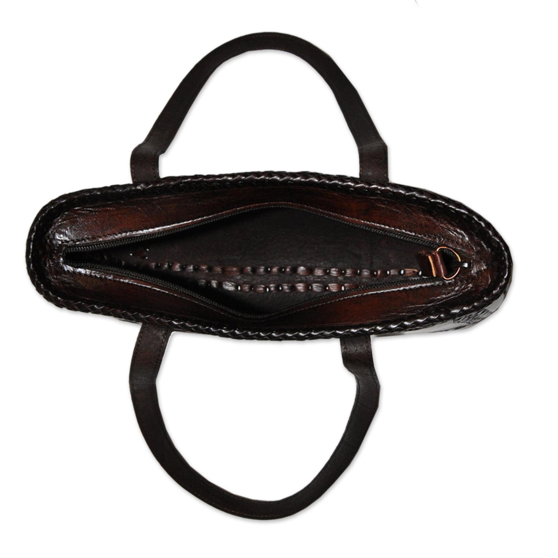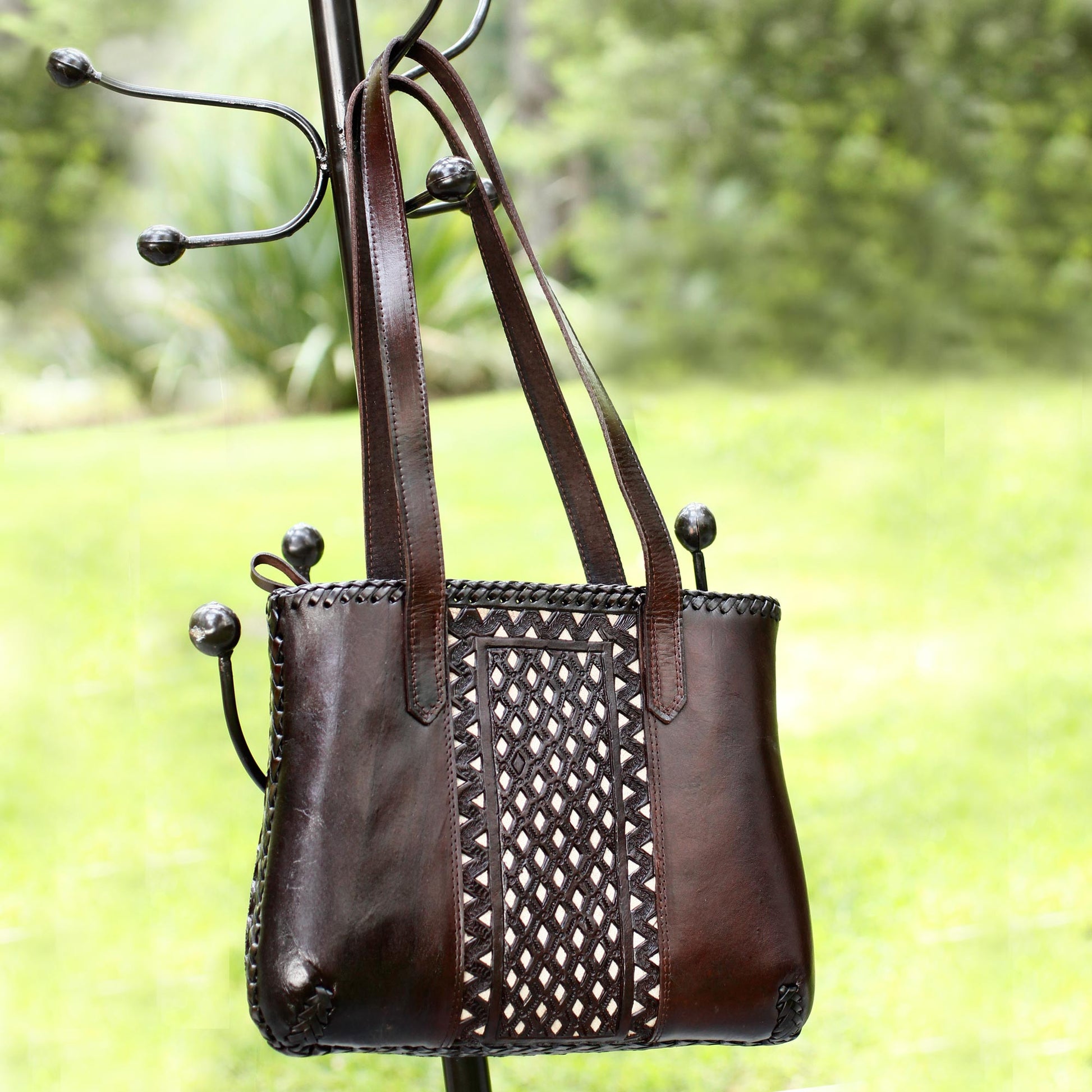 This handbag is filled with the detailed artistry of its creator, Mexico's Eduardo Alcalá. His expertise is evident in the two-tone trellis that adorns the front, and the ornate lace that drapes the back of the bag. The tote and the internal pocket close with a zipper.