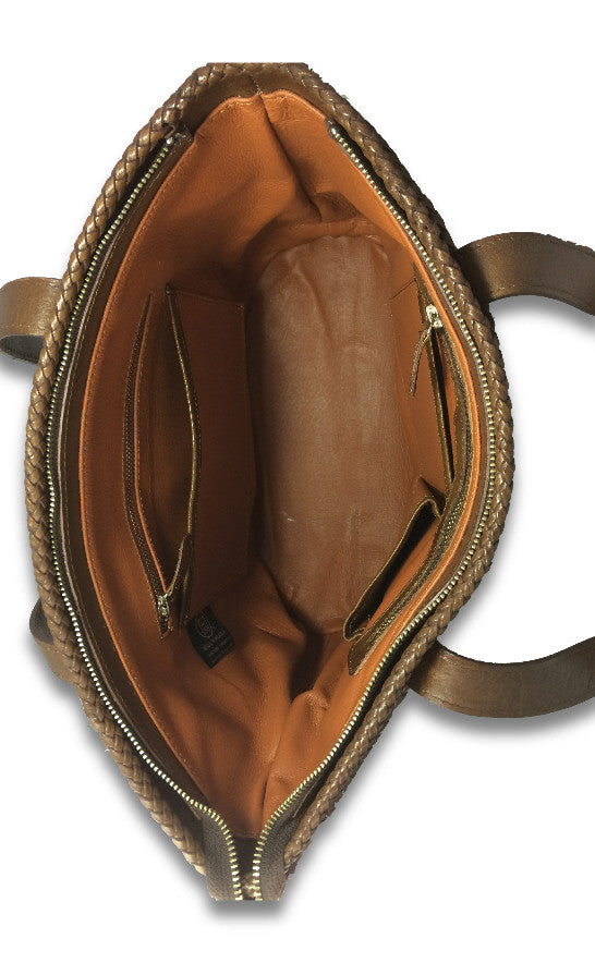 Bag is made of genuine cow leather with interior lining made of synthetic polyester, twin handle straps and zipper closure. It has plenty of space that you can easily bring your daily necessities with you, and includes two zipper pockets, and three other pockets for cell phone or glasses, pens, cosmetics, etc.