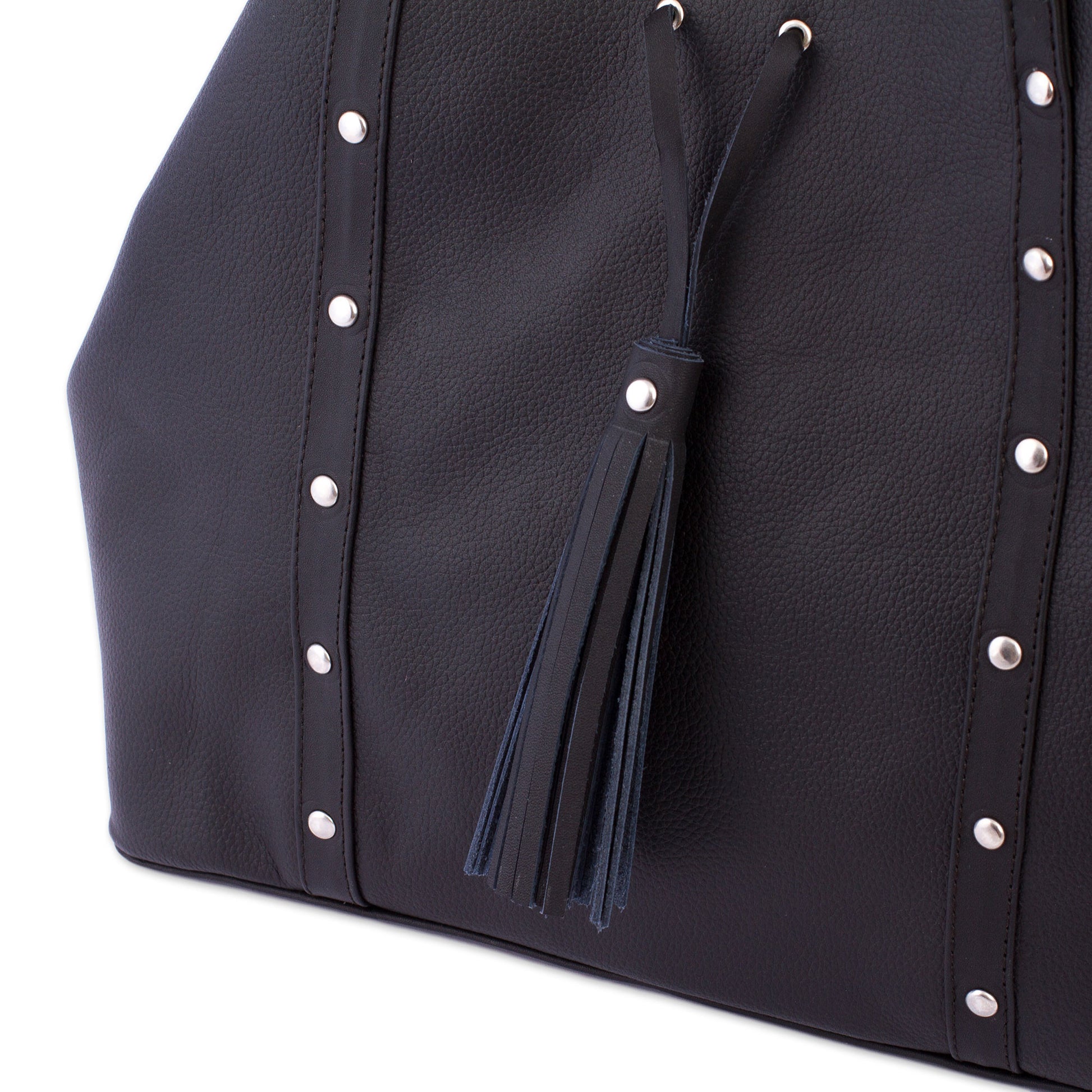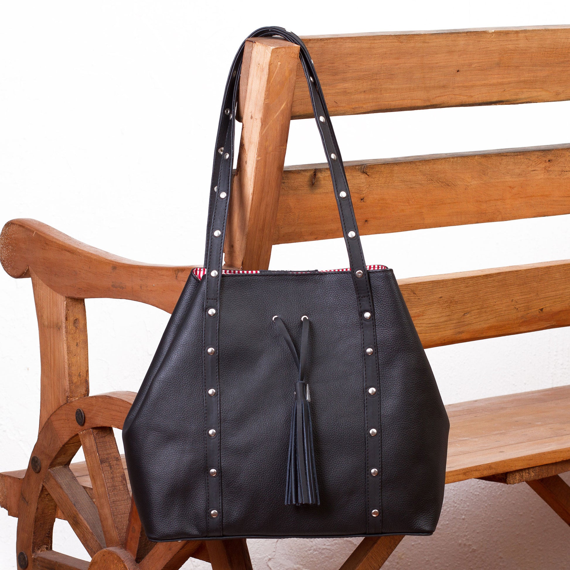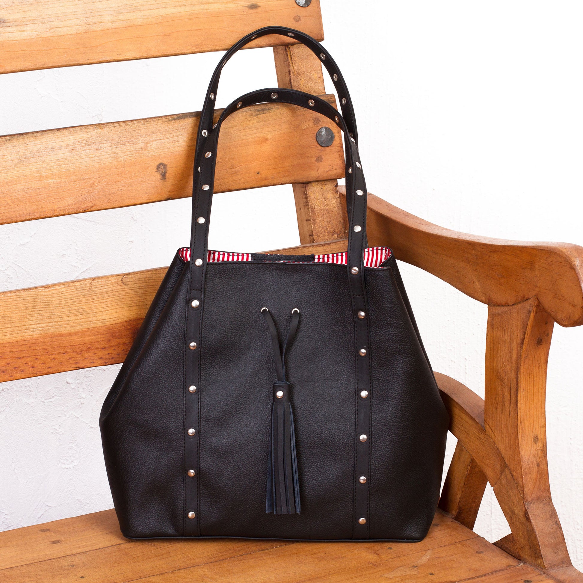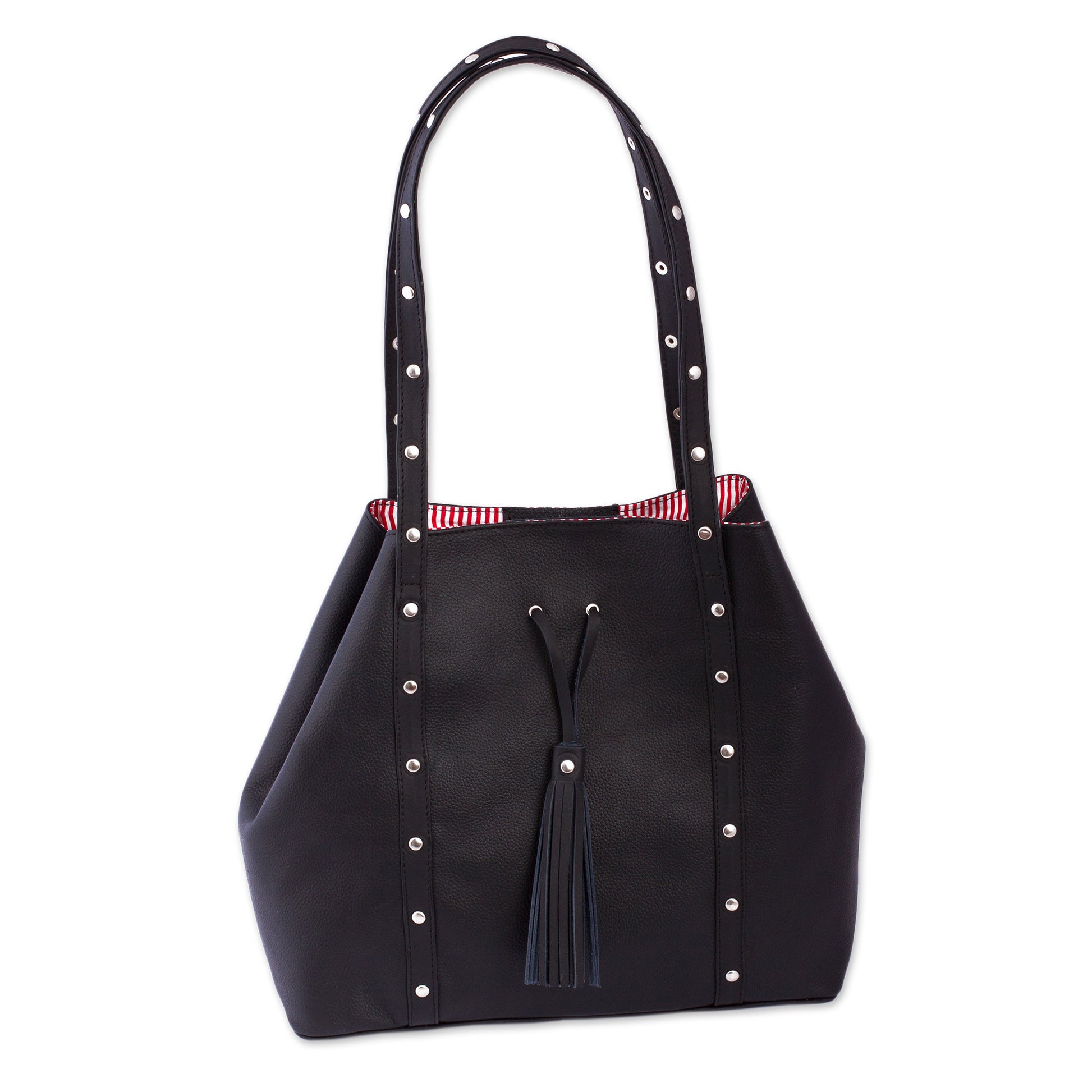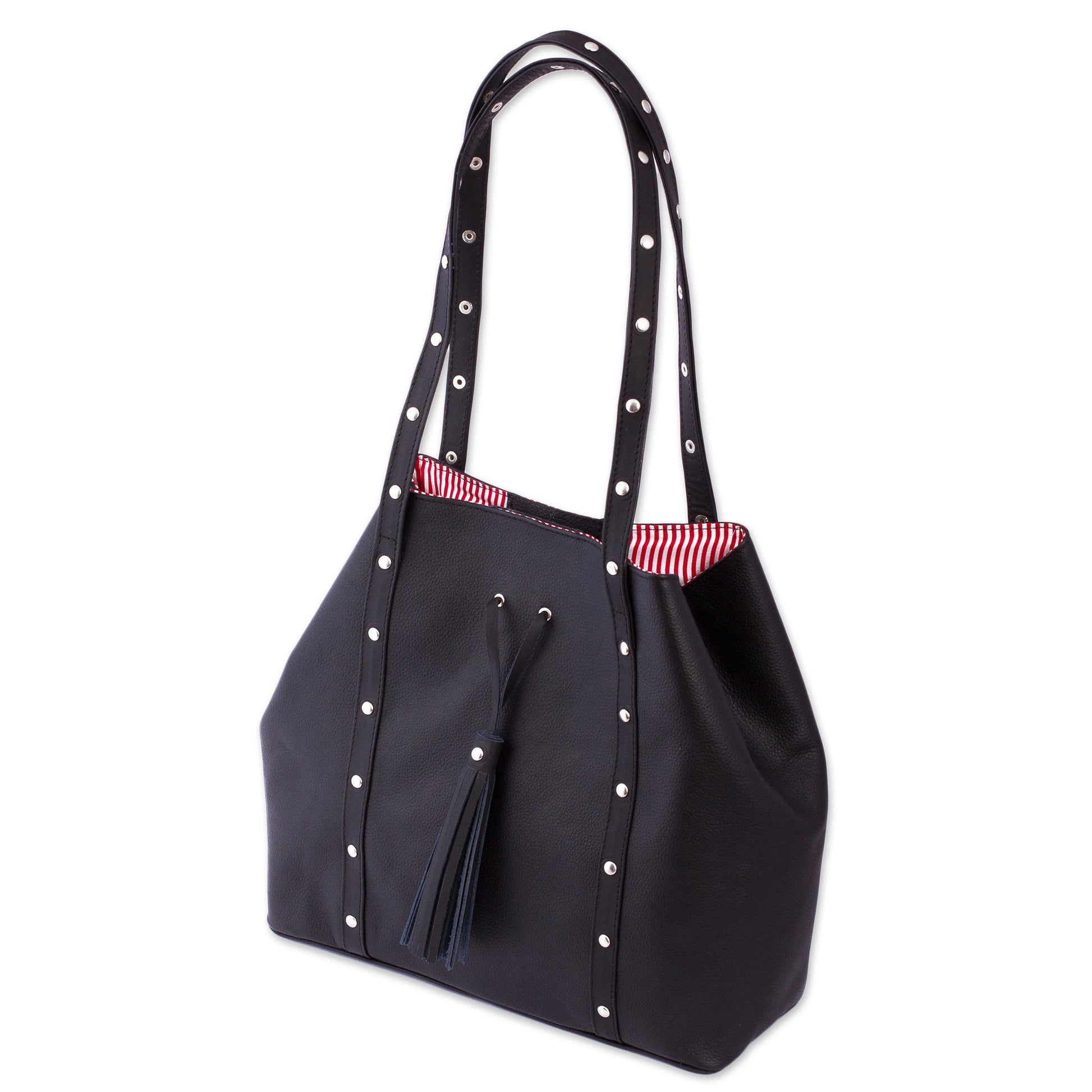 From Mexican artisan Ricardo Hinojosa comes this elegant shoulder bag. Crafted from black leather, the bag is embellished with a tassel on the front and small metal stud accents. A red and white striped fabric lining adds a bright pop of color to the classic design. The interior of the bag features two open pockets, a zippered pocket, and a magnetic snap closure.