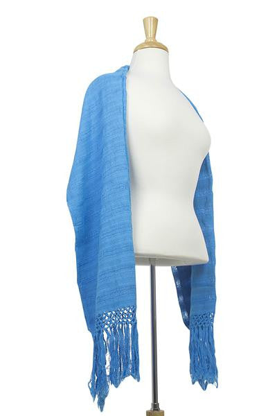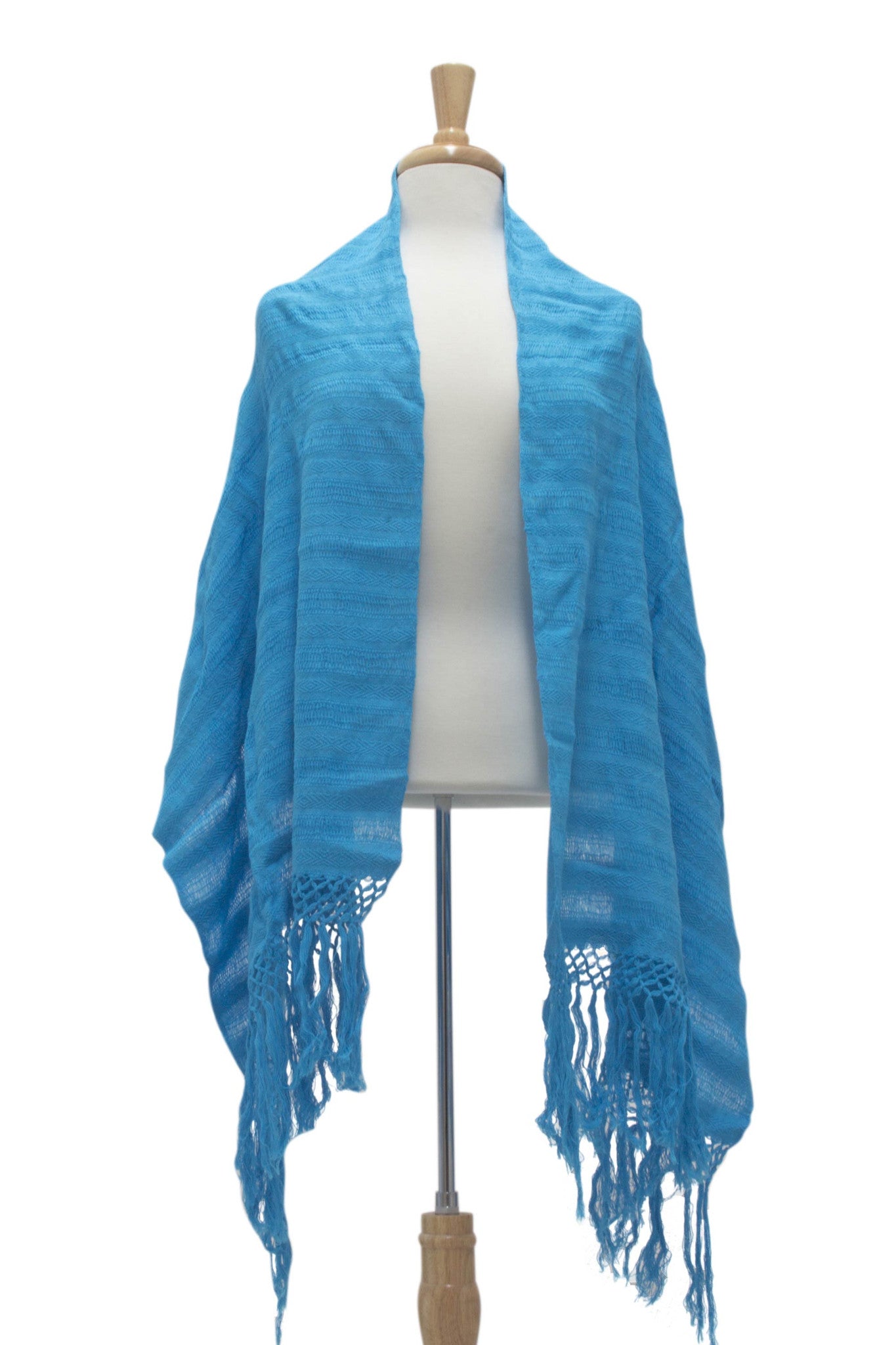 Obtaining sky blue from natural pigments, Oaxacan weavers dye cotton threads as the first step toward creating this lovely rebozo. Mexico's Patricia and Gabriela are proud to present this rebozo, which they regard as a symbol of Mexican femininity. The cotton wrap is woven on a traditional loom while the fringe is finished by hand.