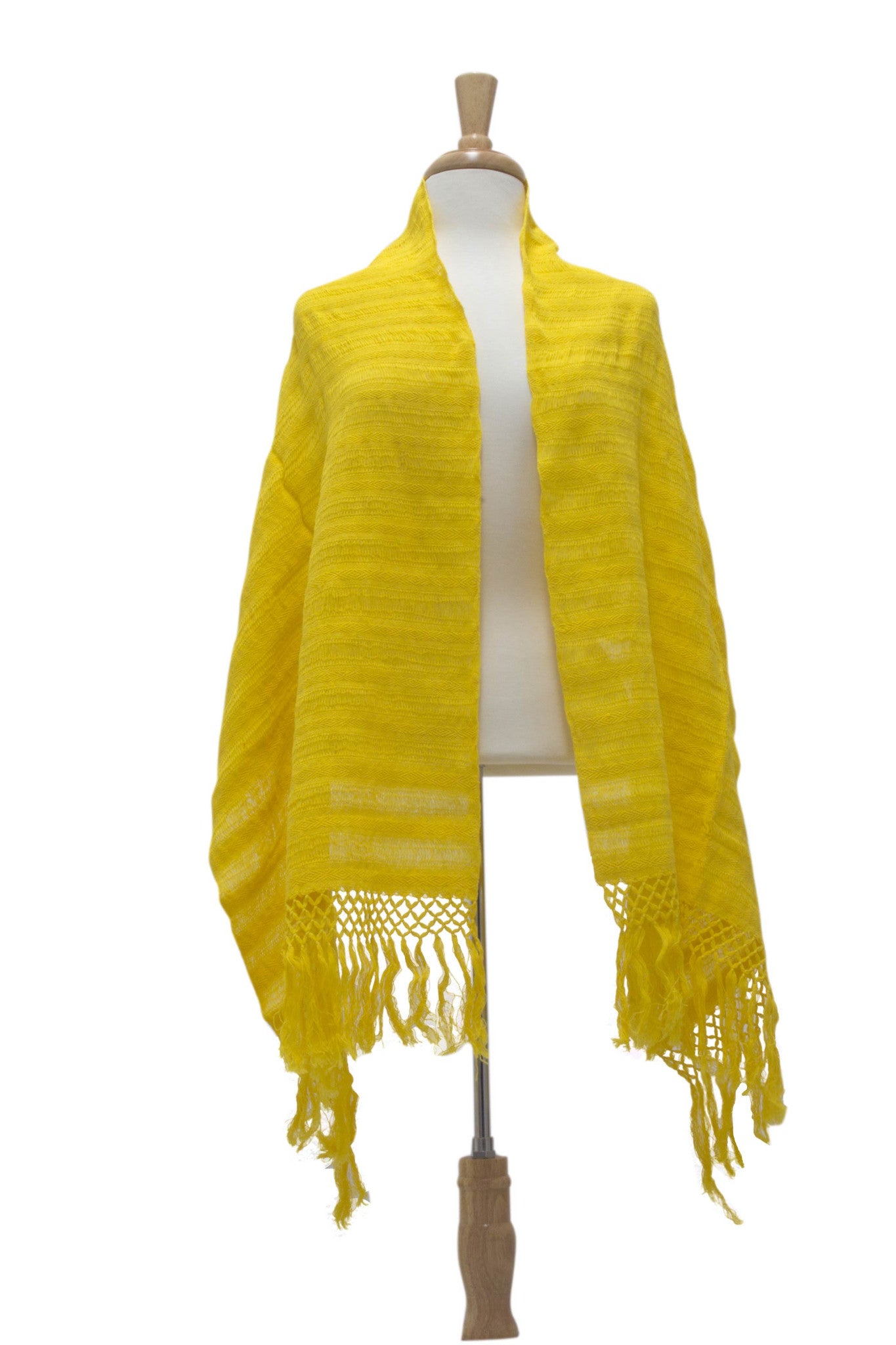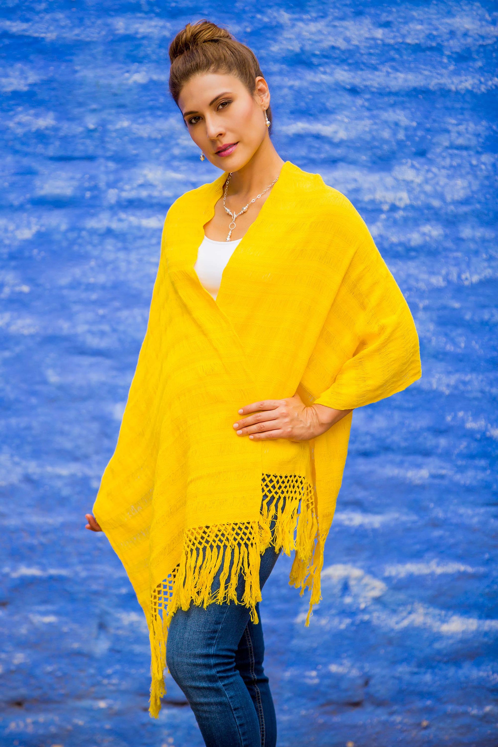 Obtaining bright yellow from natural pigments, Oaxacan weavers dye cotton threads as the first step toward creating this lovely rebozo. Mexico's Patricia and Gabriela are proud to present this rebozo, which they regard as a symbol of Mexican femininity. The cotton wrap is woven on a traditional loom while the fringe is finished by hand.