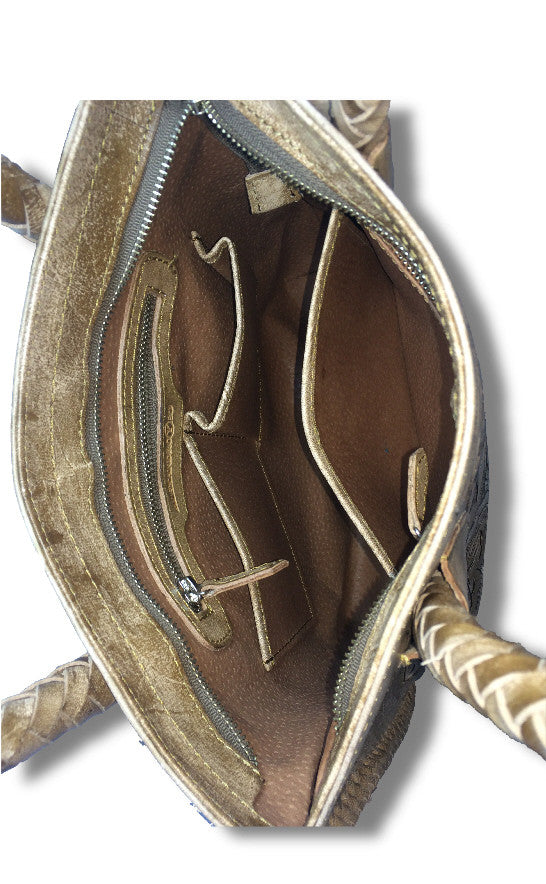 Bag is made of genuine cow leather with interior lining made of synthetic polyester, twin handle straps and zipper closure. It has enough space so you can bring your daily necessities with you, and includes two zipper pockets, and three other pockets for cell phone or glasses, pens, cosmetics, etc.