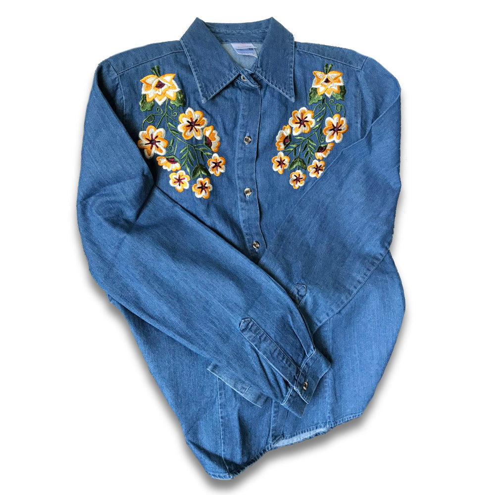 There is nothing traditional about this denim shirt, with a gorgeous hand-embroidered flower design in silk thread by artisan hands. Indigenous traditions meet with the modern denim for a beautiful result you can wear on any occasion.