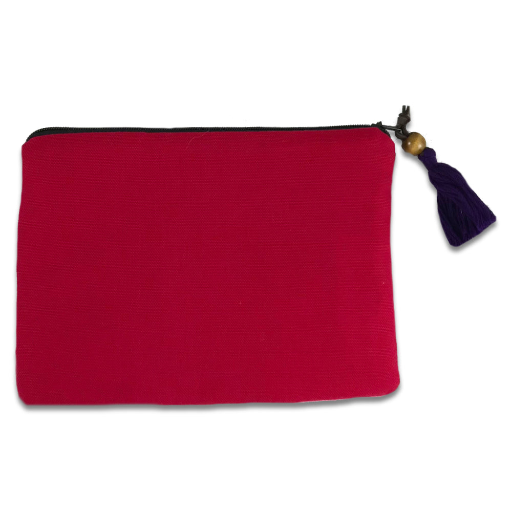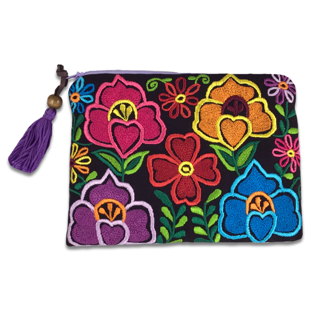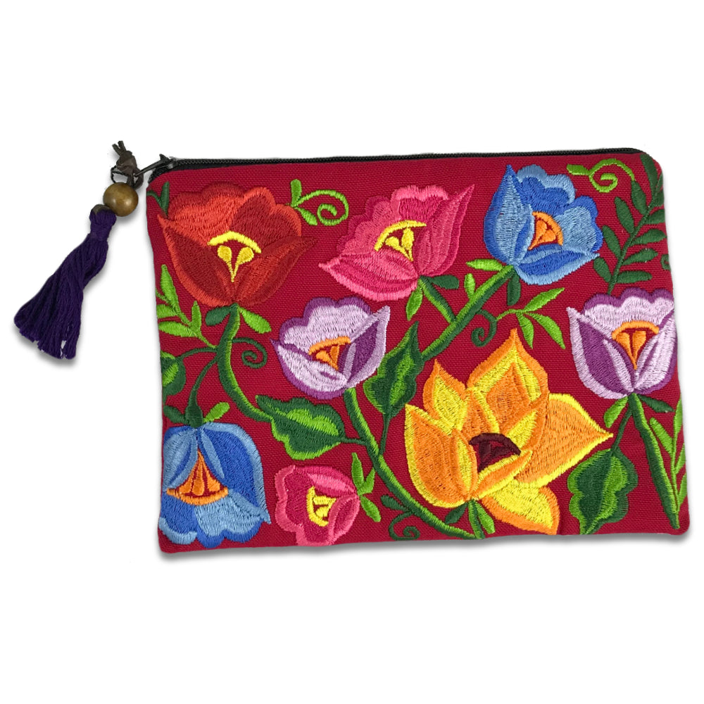 The Kanxoc Foundation of Mexico presents this hand embroidered cotton canvas clutch handbag. It beautifully shows floral designs in silk threads. A tasseled zipper secures the single compartment.