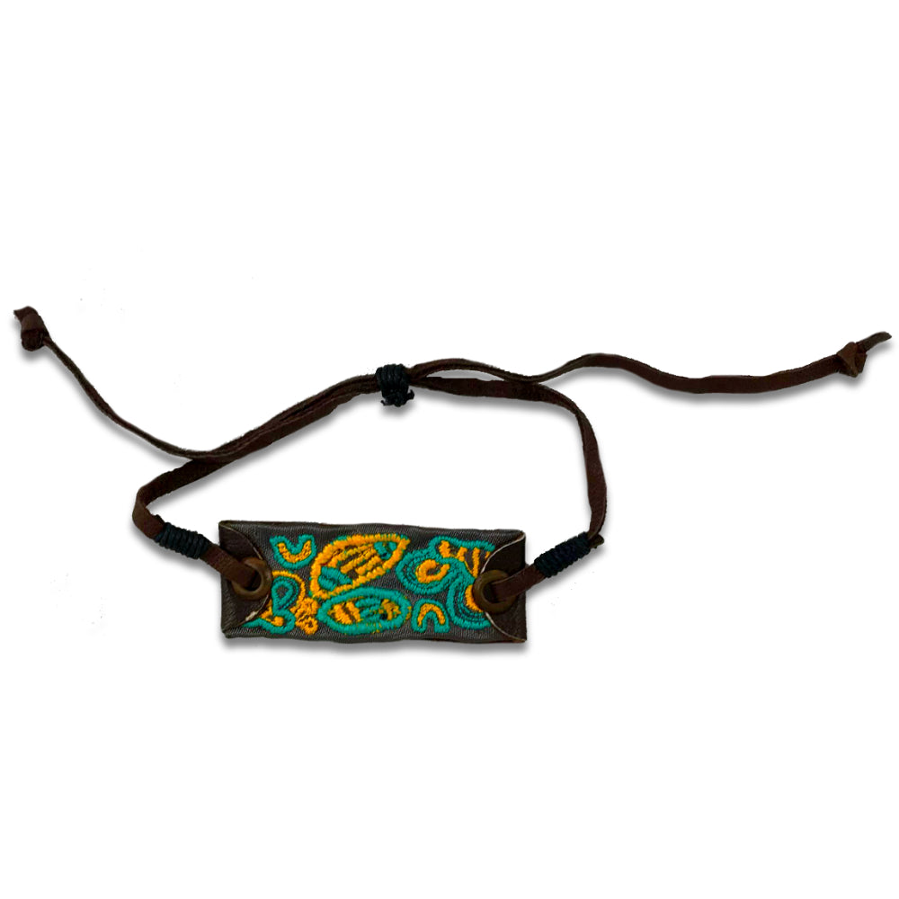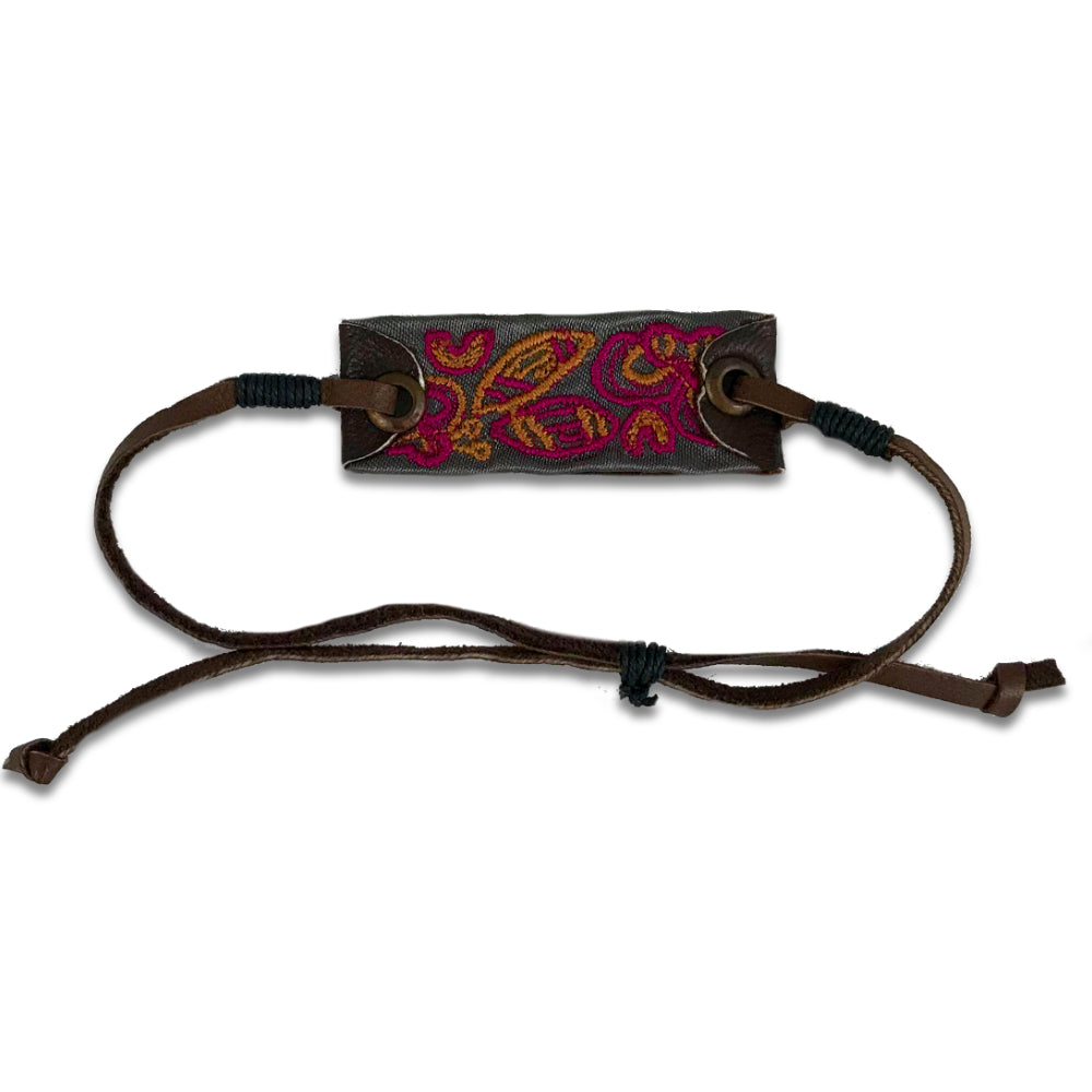 These handsome bracelets feature a band of rich brown leather with hand-embroidered silk threads and authentic indigenous designs. Leather cords encircle the wrist, and culminate in in a simple yet easy-to-adjust knot. The length can be adjusted by sliding the knot along the cords.