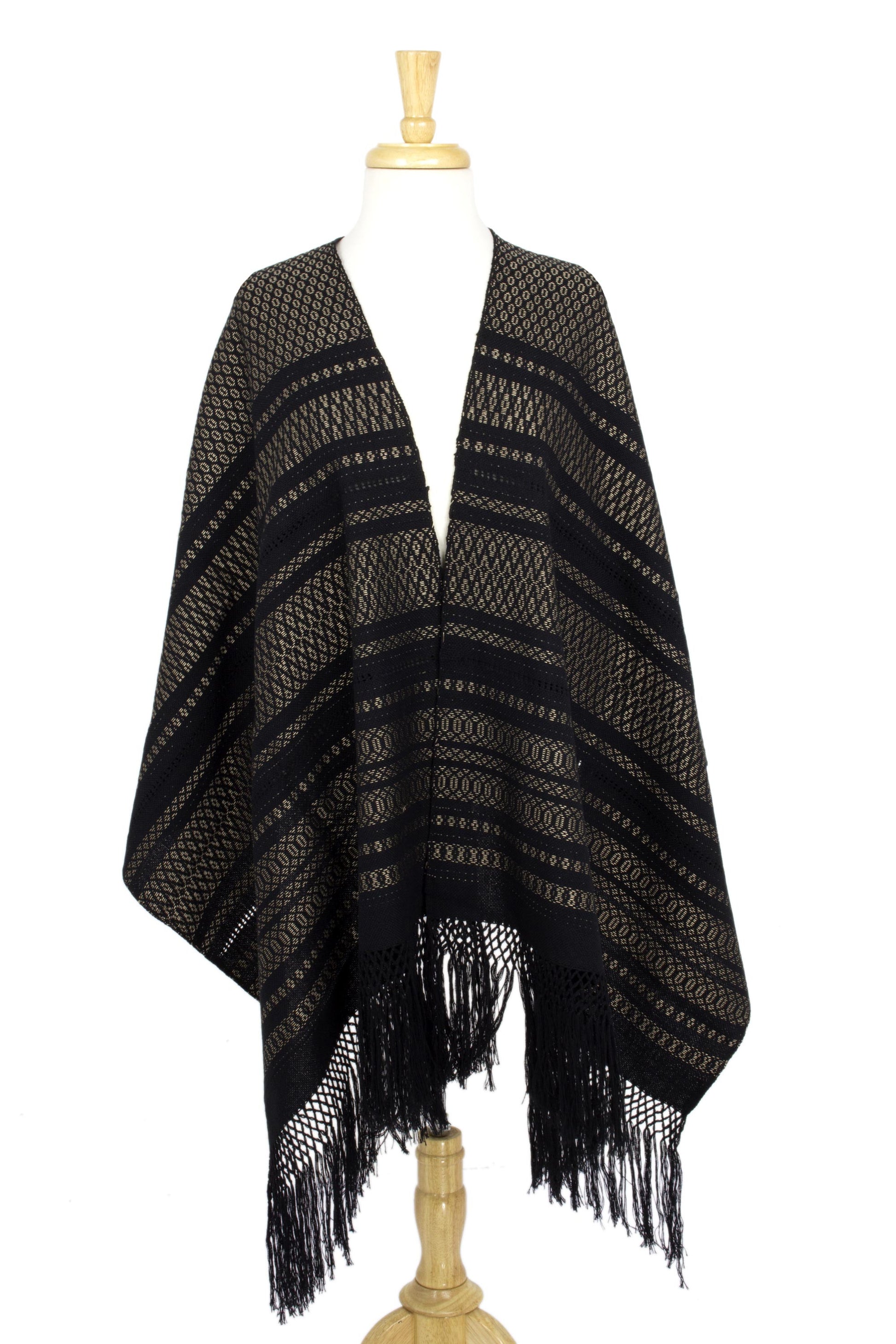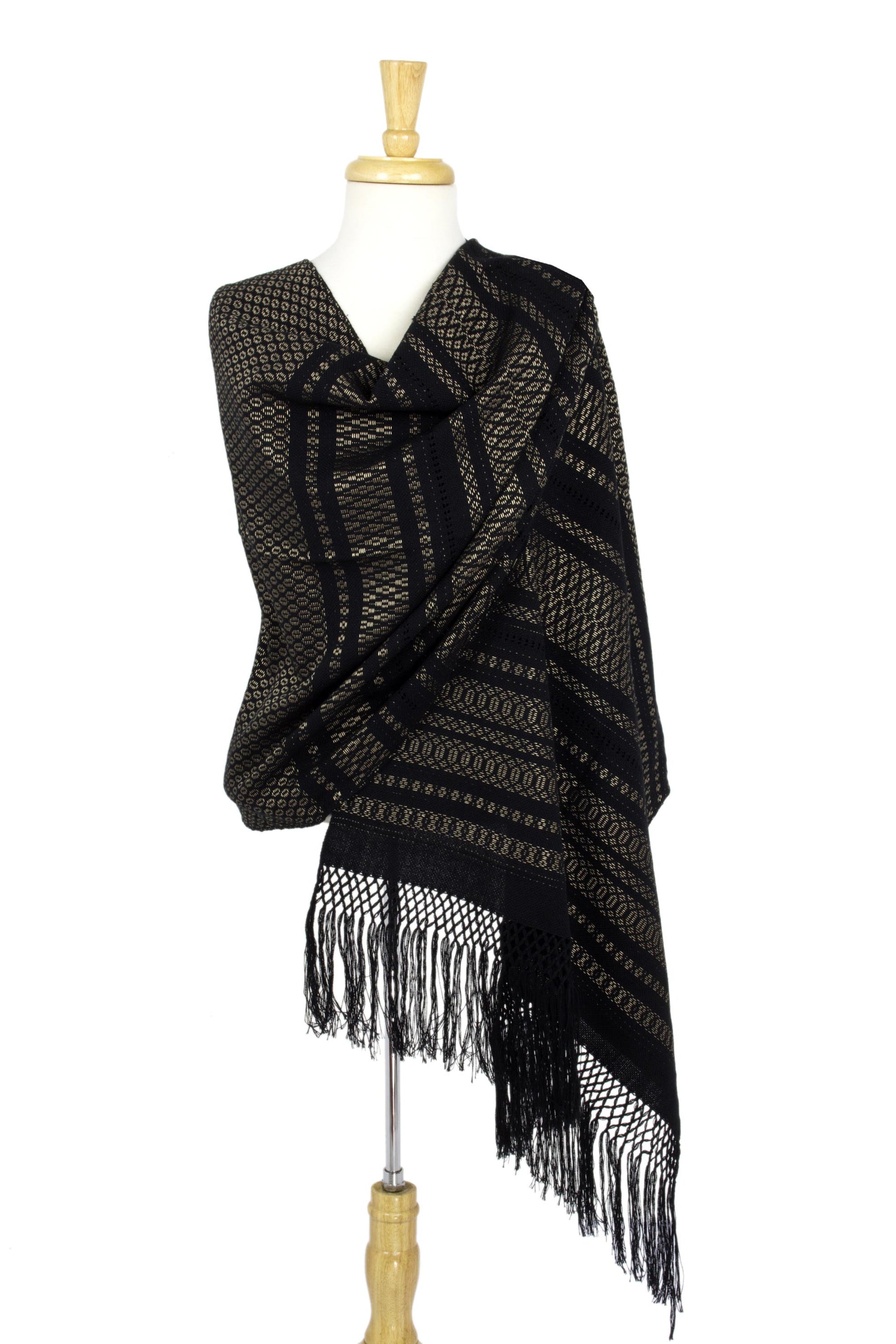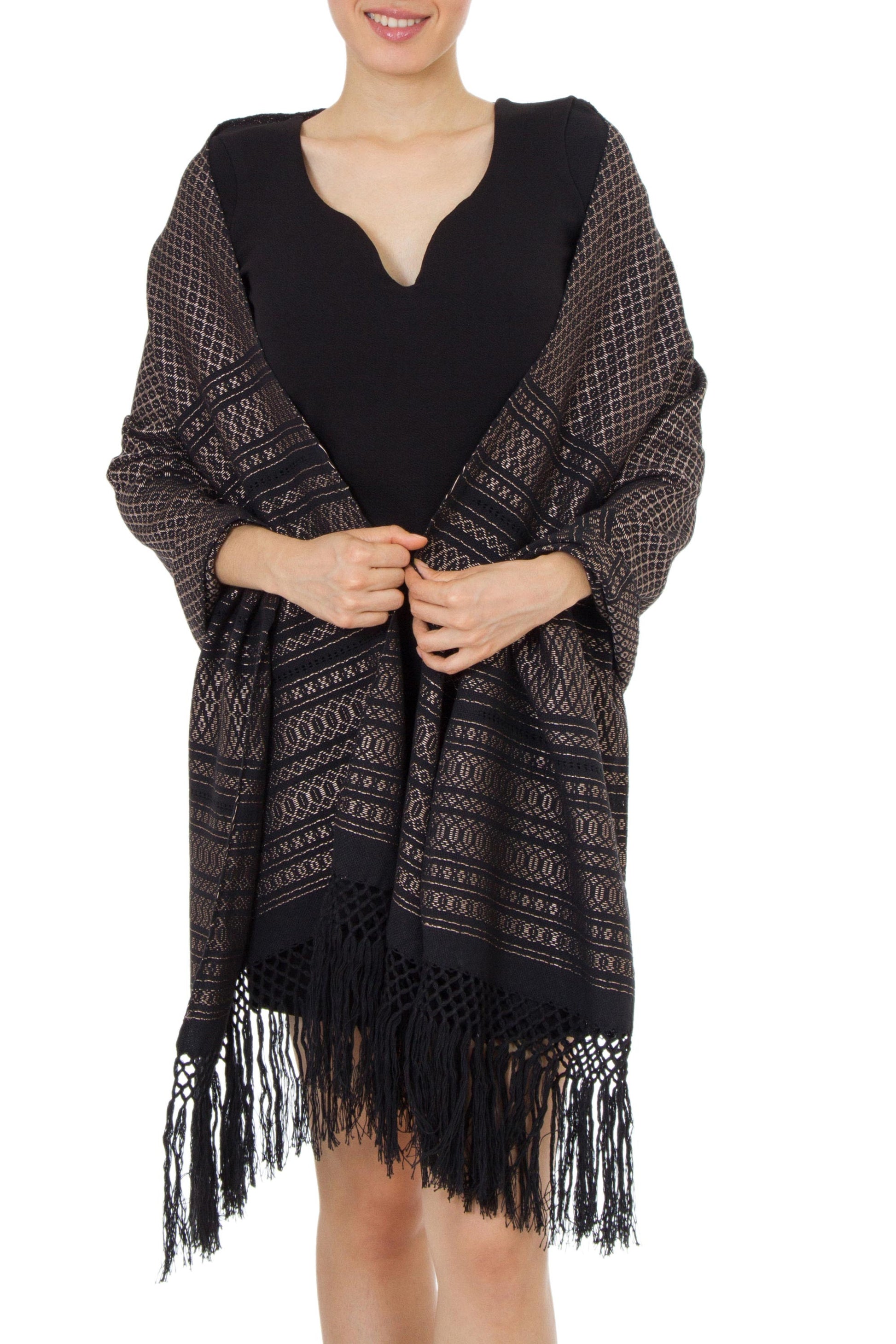 Woven by hand, this generous black rebozo shawl evokes golden stars at midnight. Angela Quiñones translates an ancient Zapotec art into elegant fashion. She works in cotton and adds long, luscious fringe in the style of Mexico's traditional rebozos.