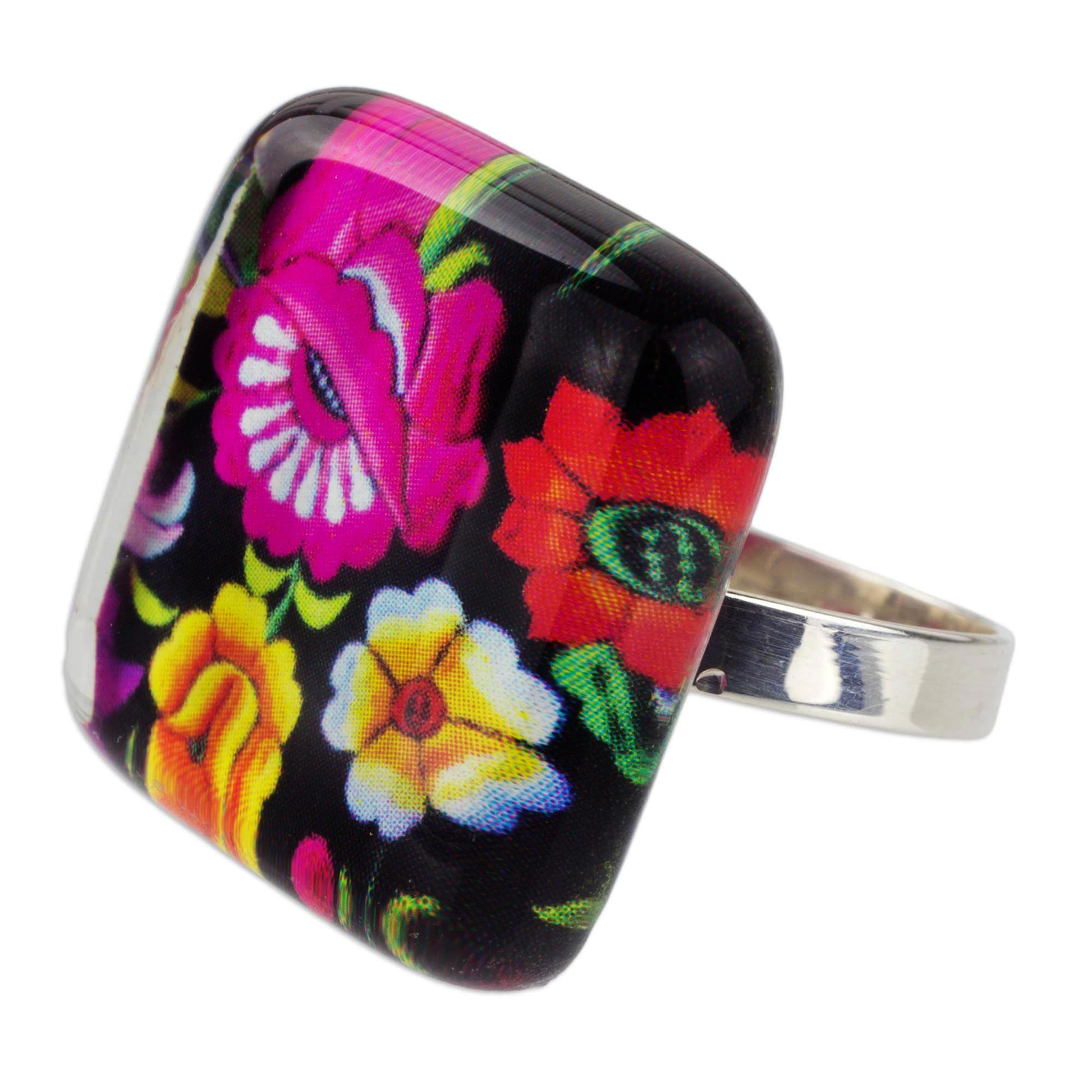 The florid embroideries on the Tehuana dresses of Oaxaca inspire the lavish design of this cocktail ring by Gretel and Daniel. Underscored by black, the multicolored flowers are printed on couché paper that is fused within glass and set atop a sterling silver band ring.