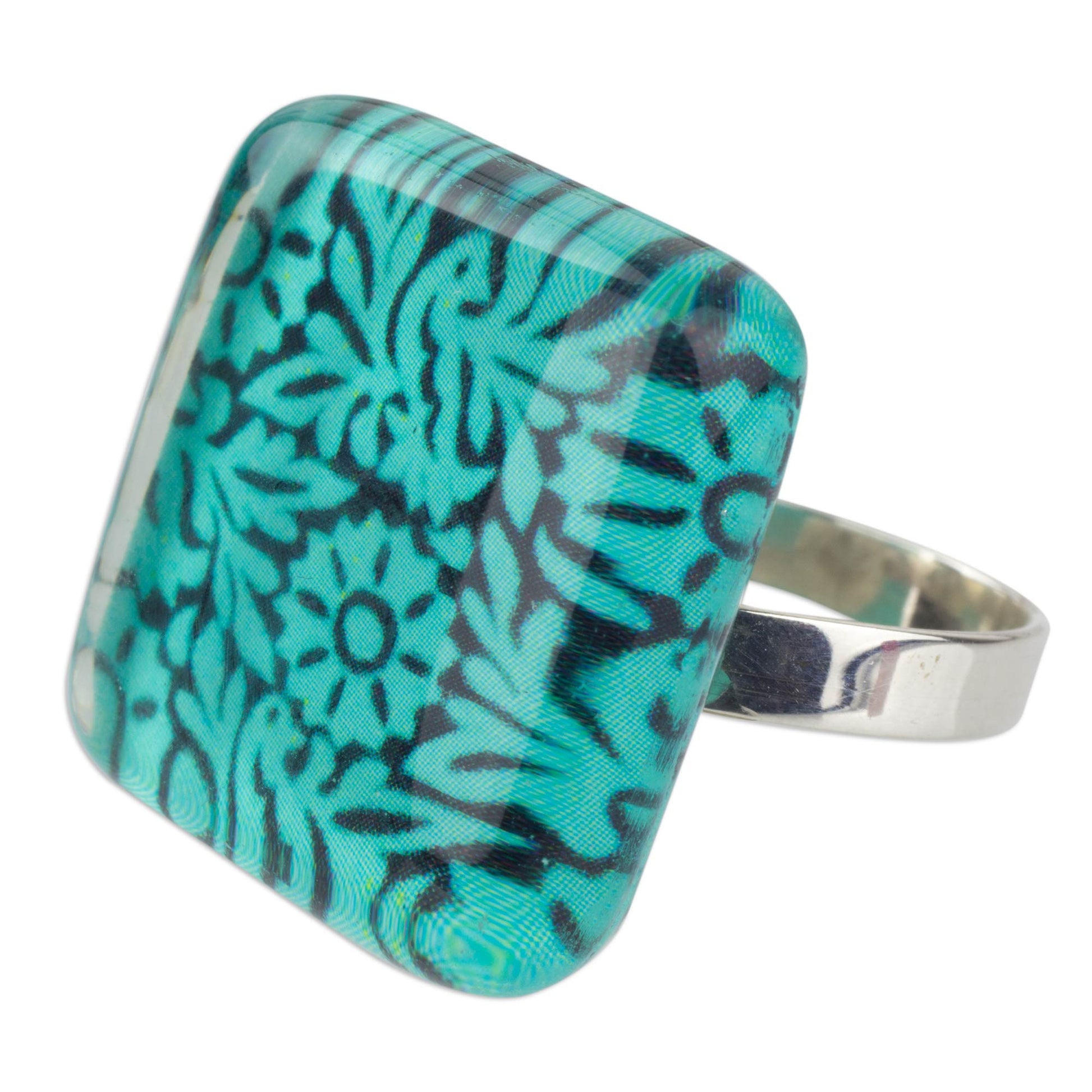 The exuberant embroideries unique to the state of Oaxaca inspire the lavish design of this cocktail ring by Gretel and Daniel. Underscored by black, the green birds and flowers are printed on couché paper that is fused within glass and set atop a sterling silver band ring.