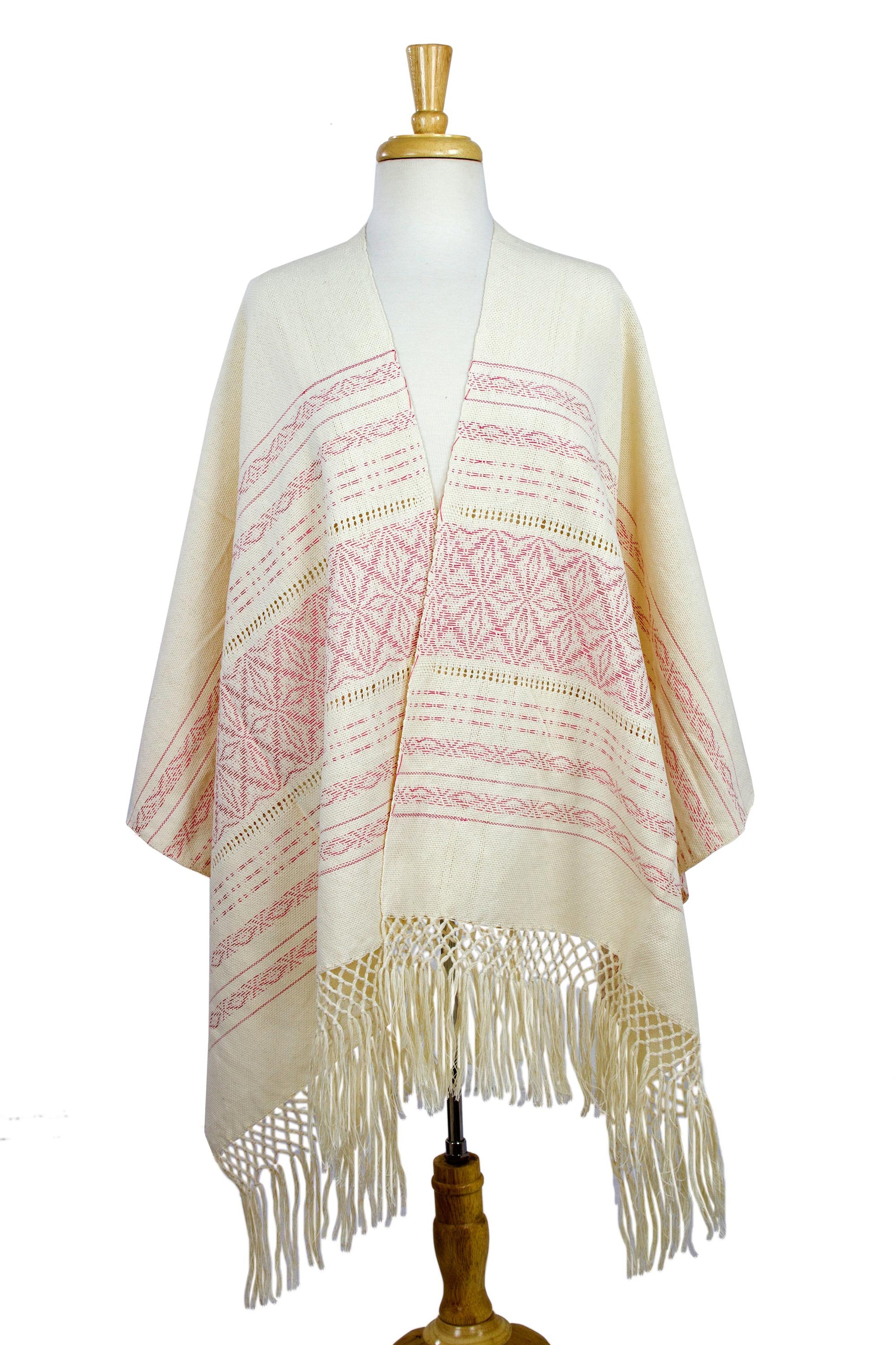 Woven by hand on a traditional loom, this shawl is a masterpiece of Zapotec textile art. Delfina Ruiz transforms ivory cotton into a beautiful wrap. Intricate star motifs in cerise enhance its beauty, and the rebozo shawl is finished with macramé fringe.