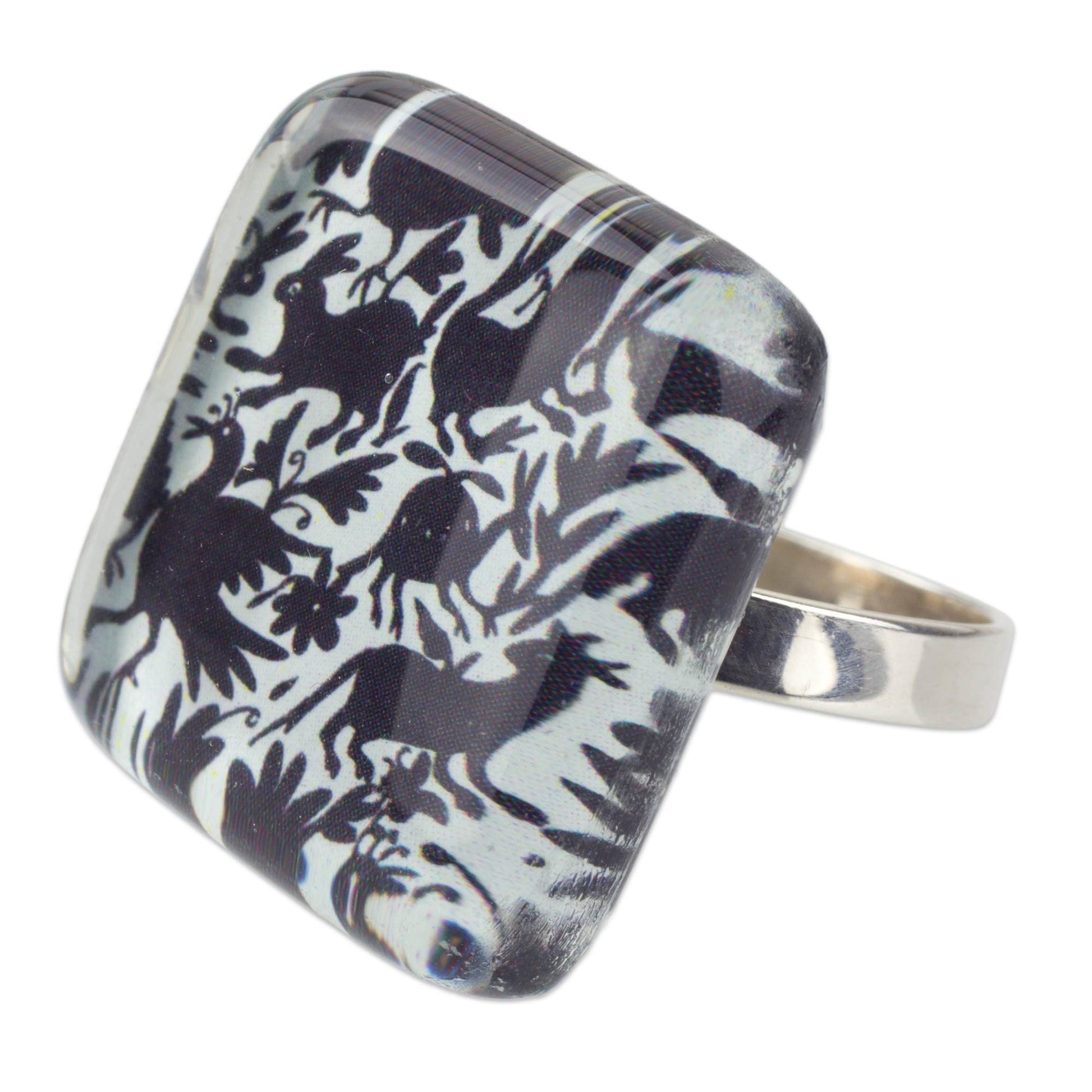 Gretel and Daniel find inspiration in the famed embroideries of Tenango for the design of this original cocktail ring. Stylized animals play among the flowers in a monochrome fantasy. The Mexican artisans master fused glass techniques and incorporate printed couché paper to craft the sterling silver ring.