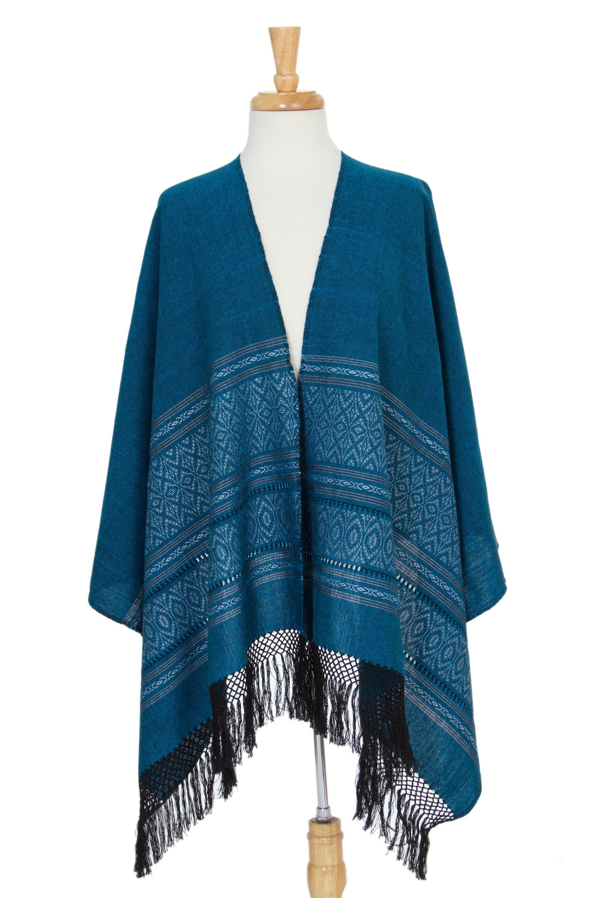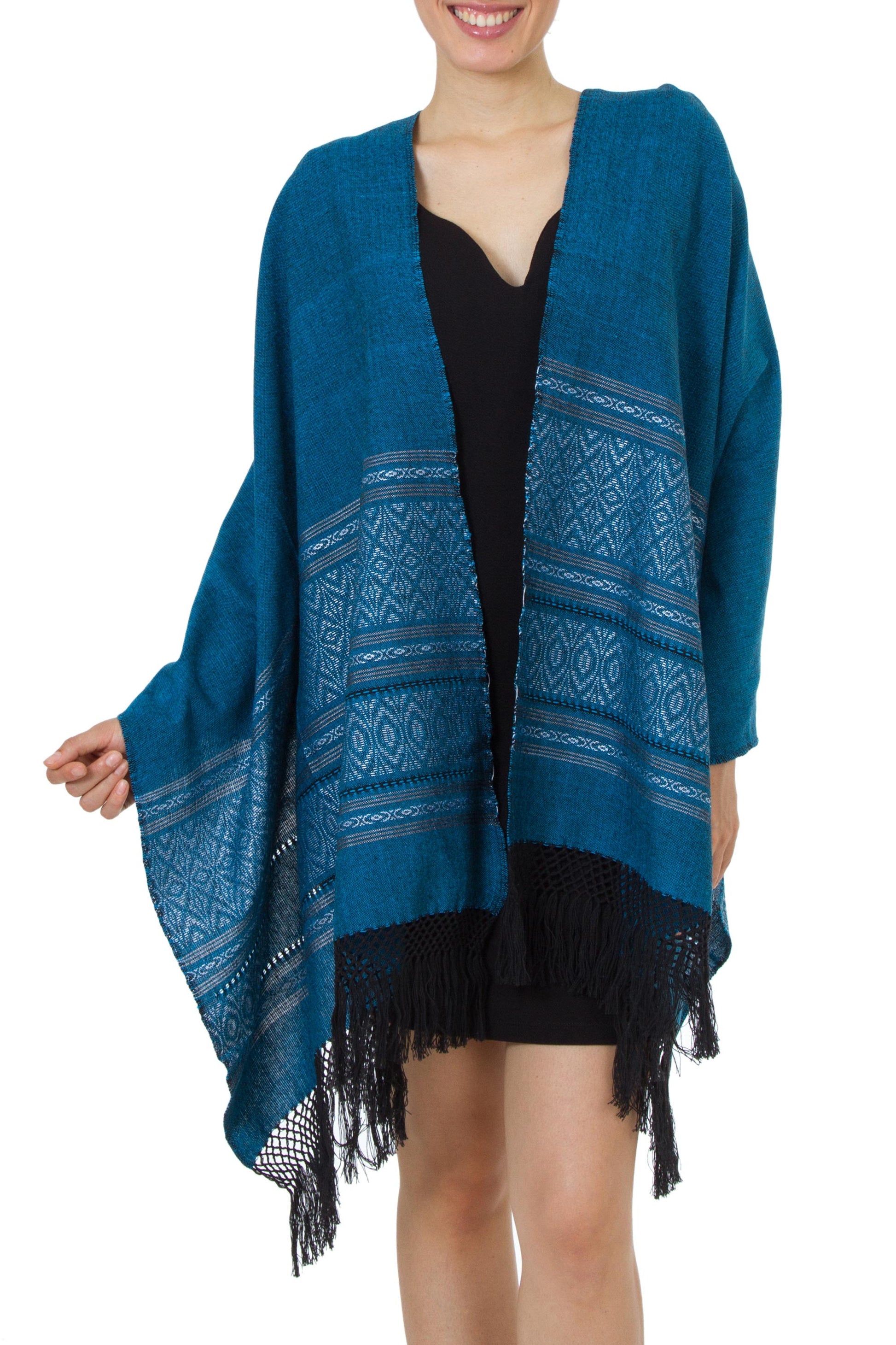 Mastering Zapotec weaving techniques, Carmen Ruiz creates a shawl of exceptional elegance. She uses indigo to obtain the rich sky blue hue, which contrasts nicely with the silver and black patterns at the end of the shawl.