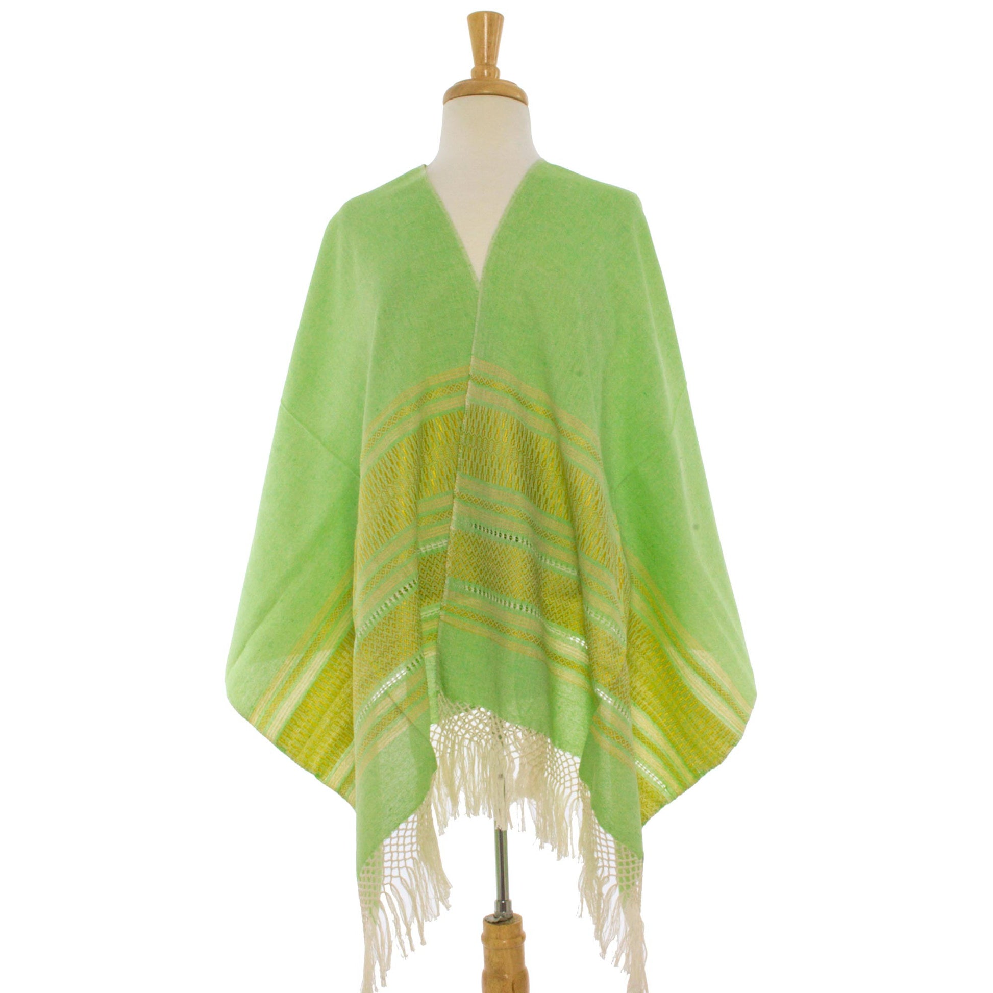Working on a traditional handloom, Carmen Ruiz weaves a beautiful shawl. The wide expanse of green cotton culminates in wide borders with precise patterns in golden yellow. A voluptuous hand tied macramé fringe completes this lovely wrap.
